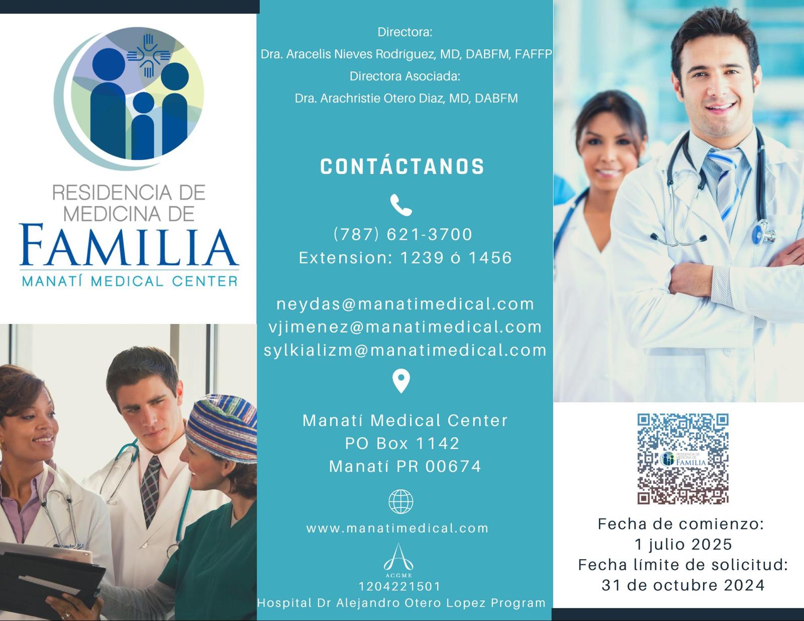 El Programa de Residencia en Medicina de Familia comenzó en Manatí Medical Center en el 1985 como un satélite de la Residencia del Hospital San Pablo en Bayamón. En 1990 el programa tuvo la primera visita del Agencia Acreditadora de Educación Médica (ACGME), donde obtuvo acreditación desde el 1991. Esta acreditación se ha mantenido de manera continua hasta el presente. El programa tiene una duración de tres (3) años y en la actualidad contamos con seis (6) residentes por nivel.